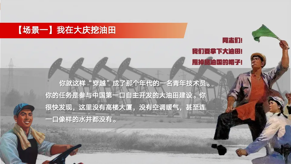 突然,一阵强光闪过,你睁开眼,发现自己站在一片荒原之上——寒风呼啸,黄沙漫天,远处是连绵不断的钻塔,红旗在风中猎猎作响;耳边传来广播的声音:“同志们!我们要拿下大油田,甩掉贫油国的帽子!”