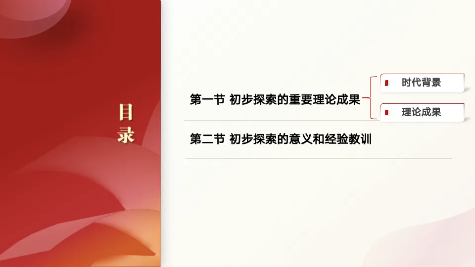 第一节 初步探索的重要理论成果中,我们首先会讲到这一时期的时代背景,也就是在怎样的时代背景下,以毛泽东为主要代表的共产党人开始思考,如何将马克思主义基本原理同中国具体实际进行“第二次”结合,努力找到适合中国国情的社会主义建设道路。