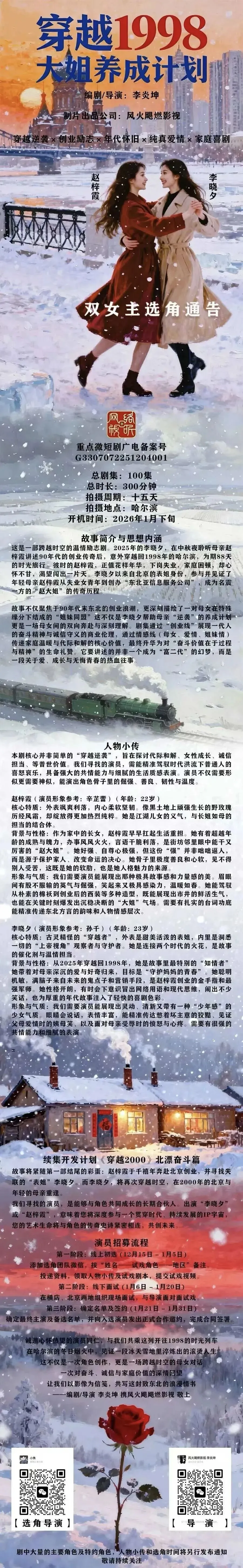 >【26年1月 哈尔滨】短剧《穿越1998:大姐养成计划》招募演员