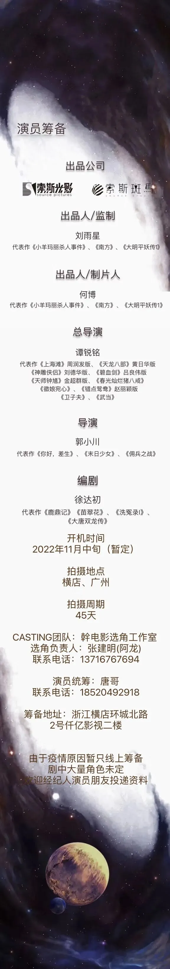 本栏目发布组讯由小编采集与业界共享,组讯如有变化请以实际情况为准。如果遇到剧组收费情况,请谨慎对待并私信官微@戏客Seeker,我们会公示问题组讯并及时处理。谢谢。