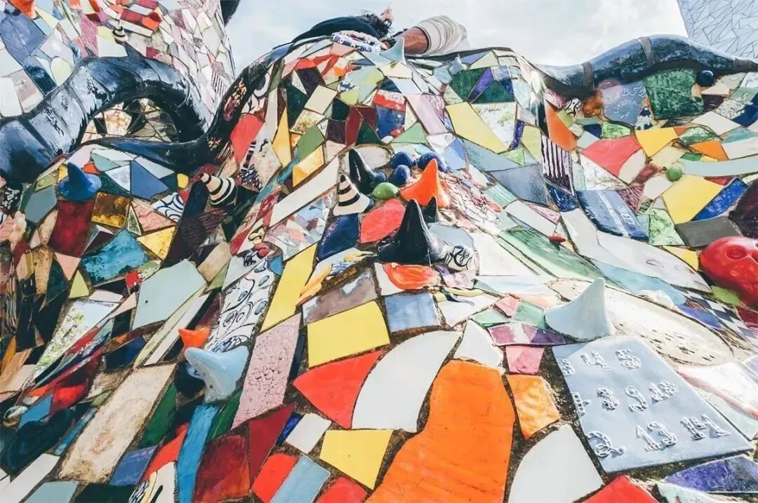 这些雕塑来自于妮基的幻想和感官世界,上面由镜子碎片、玻璃、色彩鲜艳的陶瓷马赛克扥材料覆盖,呈现出缤纷奇趣的样子,这些充满神秘主义色彩的雕塑与建筑是妮基潜意识外化的产物,是她在梦幻般的想象中倾情打造的精神世界,如NANA那种情绪的延续,充满着一种欢乐感,也构建了妮基独特的艺术语言。