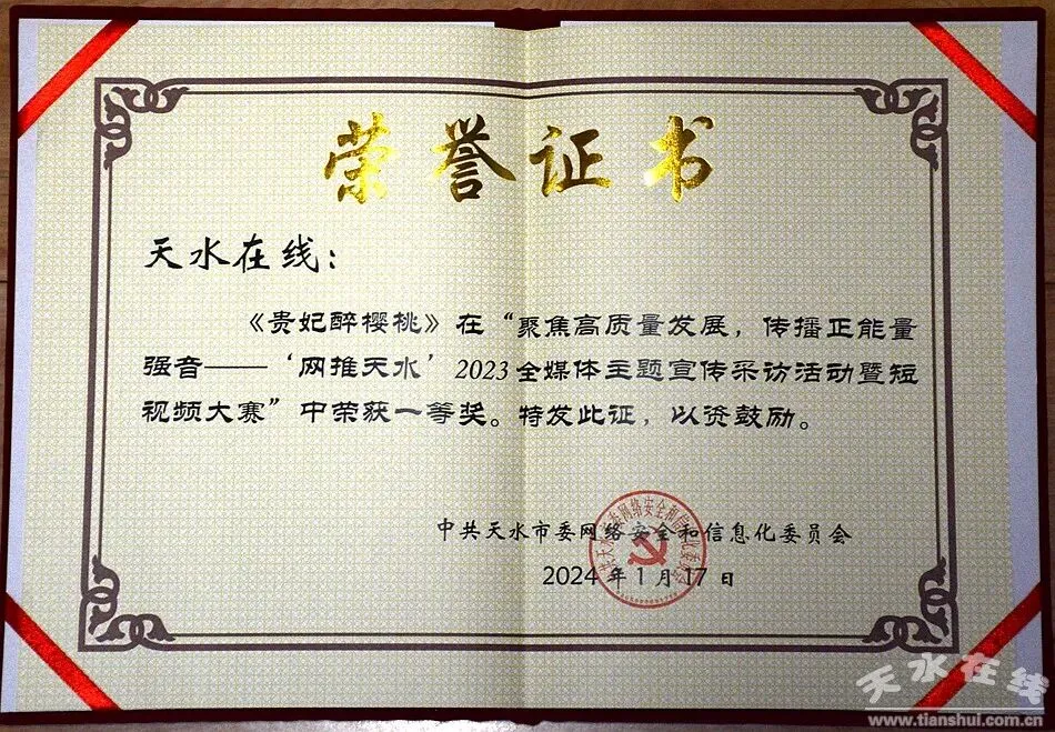 在2024年2月3日召开的全市网信工作会议上,天水在线拍摄的穿越短剧《贵妃醉樱桃》荣获中共天水市委网络安全和信息化委员会颁发的“网推天水”2023全媒体主题宣传采访活动暨短视频大赛一等奖。