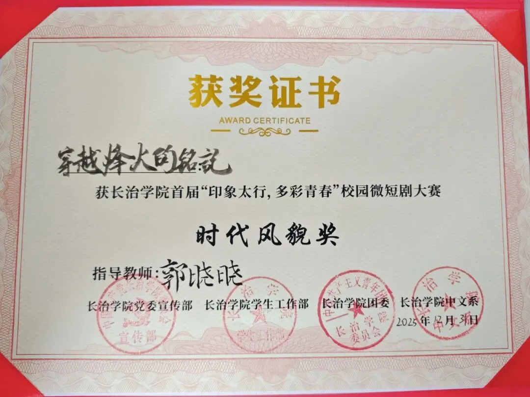 近日,由我系师生自编自导自演的青春思政教育系列微短剧《穿越烽火的铭记》,在长治学院第一届“印象太行 多彩青春”校园微短剧大赛中获一等奖,同时摘得时代风貌奖、最佳女主角两项单项奖。
