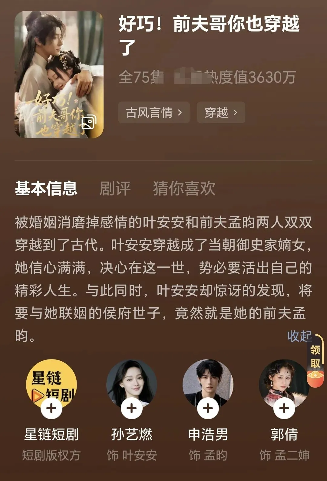 最近先婚后爱型的剧一下子上多部,虽然演员不同各有期待,但相似太多的剧还是看不下去,就想找不一样类型的剧看,《好巧!前夫哥你也穿越了》这部看着介绍还行,男女主也都是我喜欢的演员,看完也还算甜。