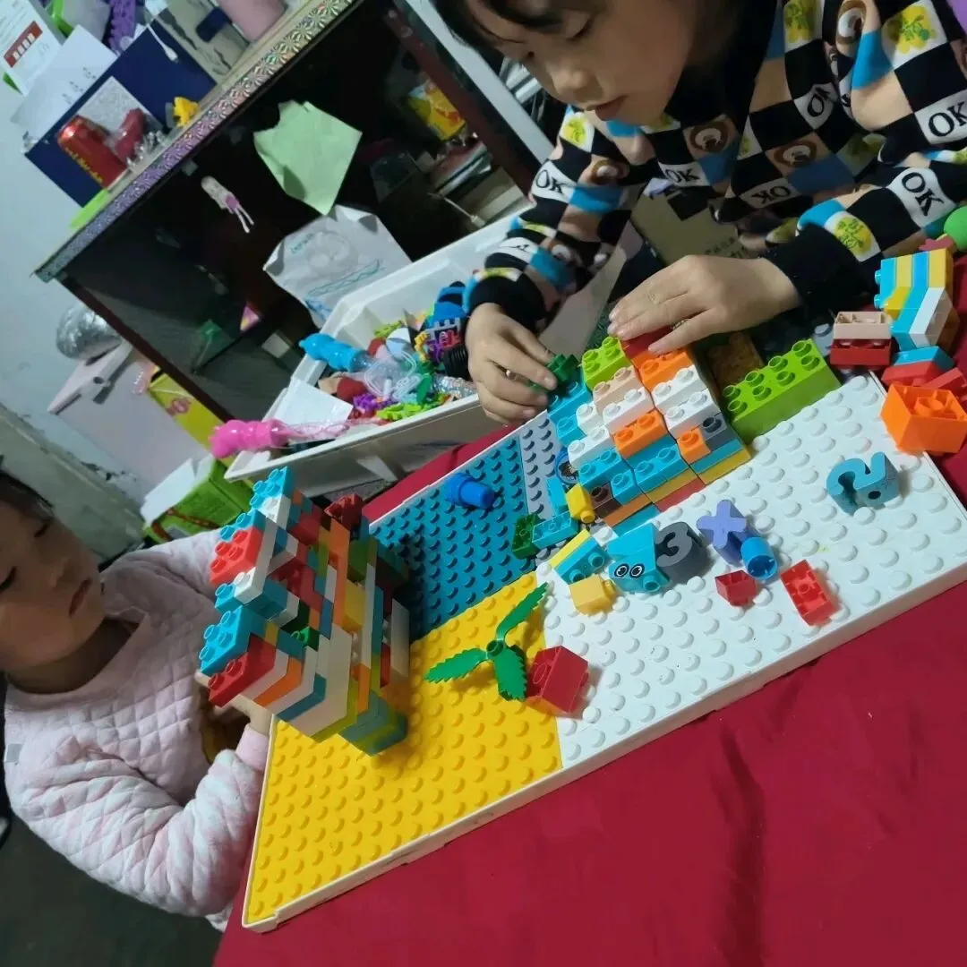 两个小家伙也很给力,起床后就自己跑去搭积木,两人叽叽喳喳地玩了整整一个小时,我们才去吃早餐。