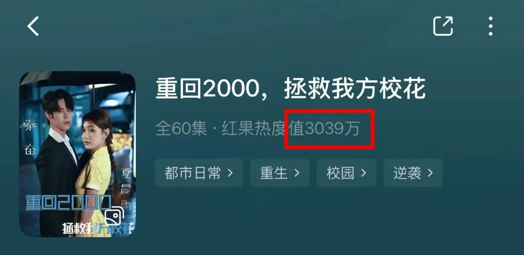 最近刷屏全平台的爆款短剧 《重回2000 拯救我方校花》 仅上线两天红果热度飙升3039w,抖音4238